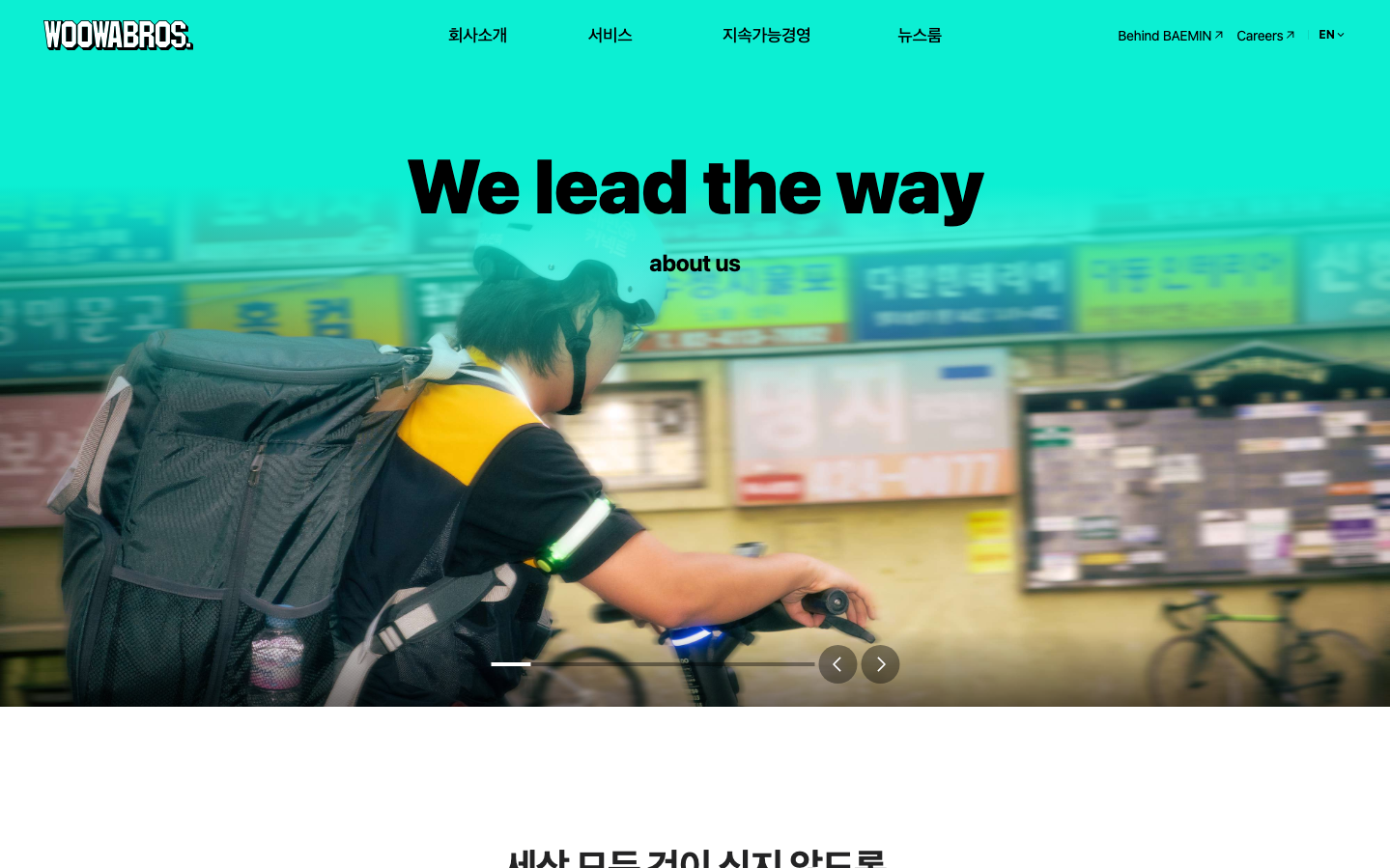 Woowa Bros creates a vibrant, kinetic brand identity that captures the urgency and motion of food delivery through electric turquoise gradients and bold impact typography. The aesthetic radiates youthful energy and street-level hustle, positioning delivery workers as urban heroes in motion.