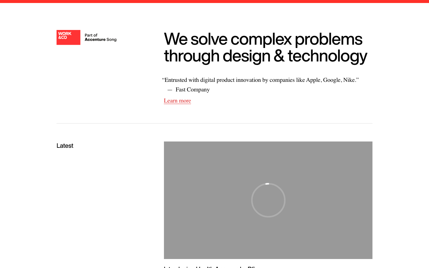Work & Co presents an editorial-inspired aesthetic that balances corporate credibility with creative sophistication. The serif body typography against Helvetica headlines creates a publishing-meets-consulting tension, while the stark red accent punctuates an otherwise monochromatic palette. The generous whitespace and video-centric layout suggests confidence in letting their work speak louder than flashy design tricks.