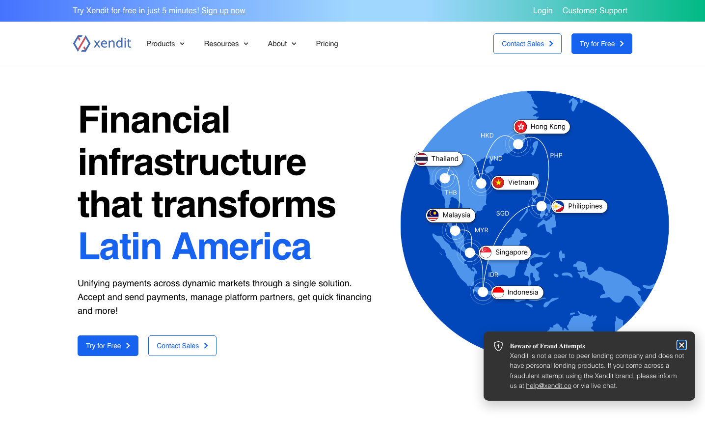 Xendit presents a bold, globally-minded fintech identity that balances corporate authority with accessibility. The gradient sky-to-ocean backdrop creates an aspirational, borderless feeling that mirrors their cross-border payment mission, while the massive bold typography commands attention without intimidation.