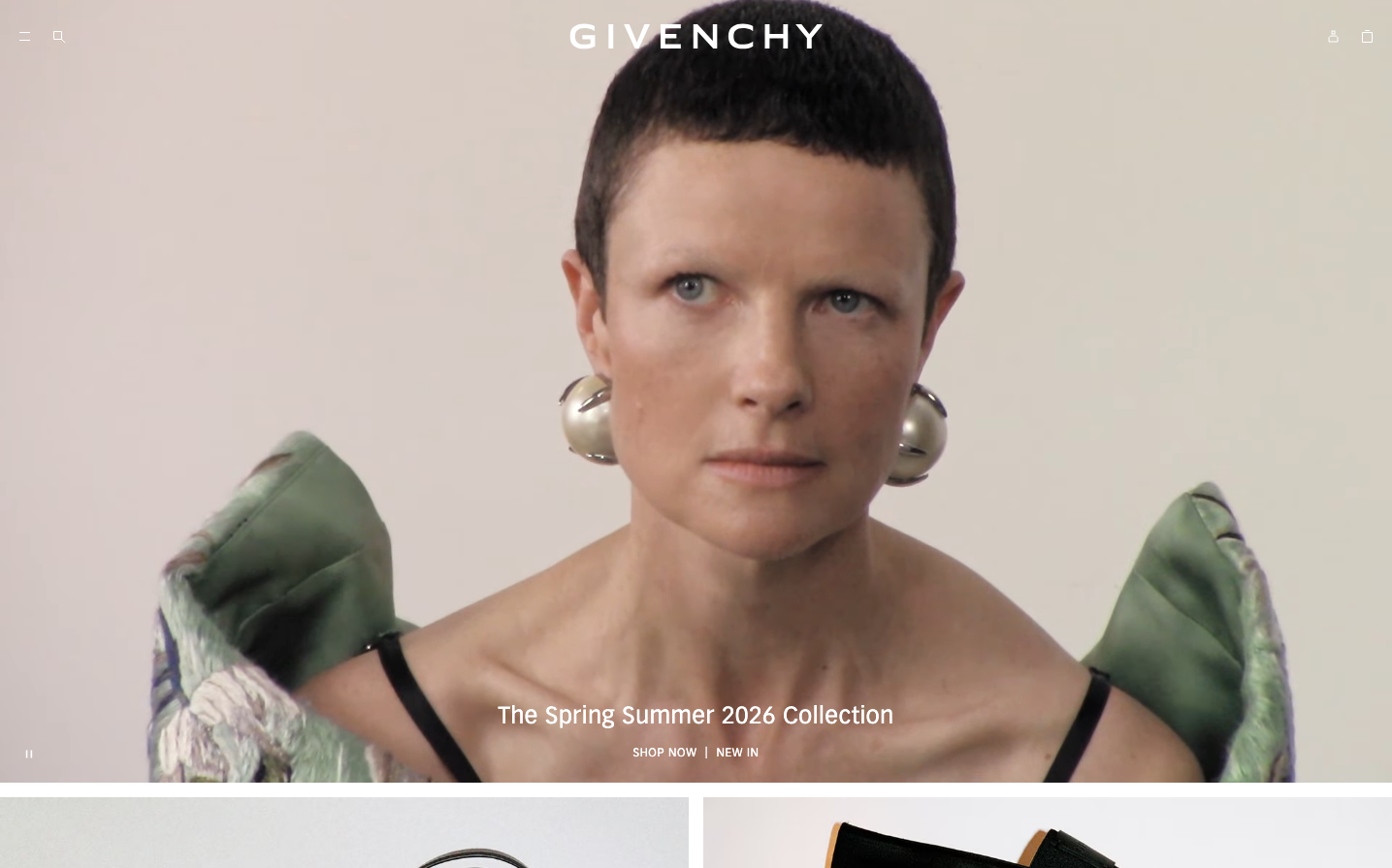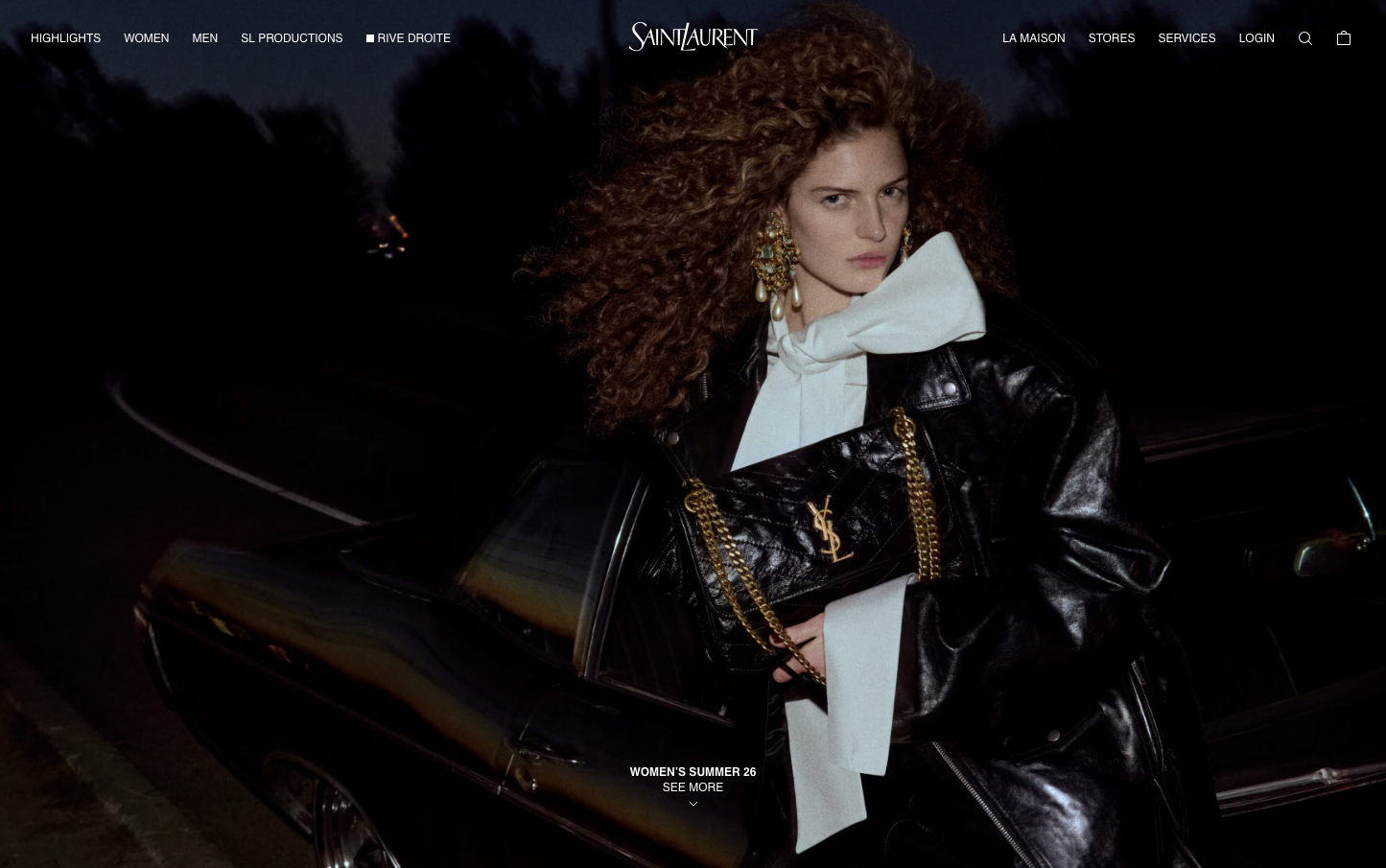 Saint Laurent's digital presence exudes Parisian haute couture rebellion through stark monochromatic contrasts and whisper-thin Helvetica typography. The aesthetic marries underground rock culture with luxury fashion house sophistication, creating an atmosphere of nocturnal elegance and rebellious refinement.