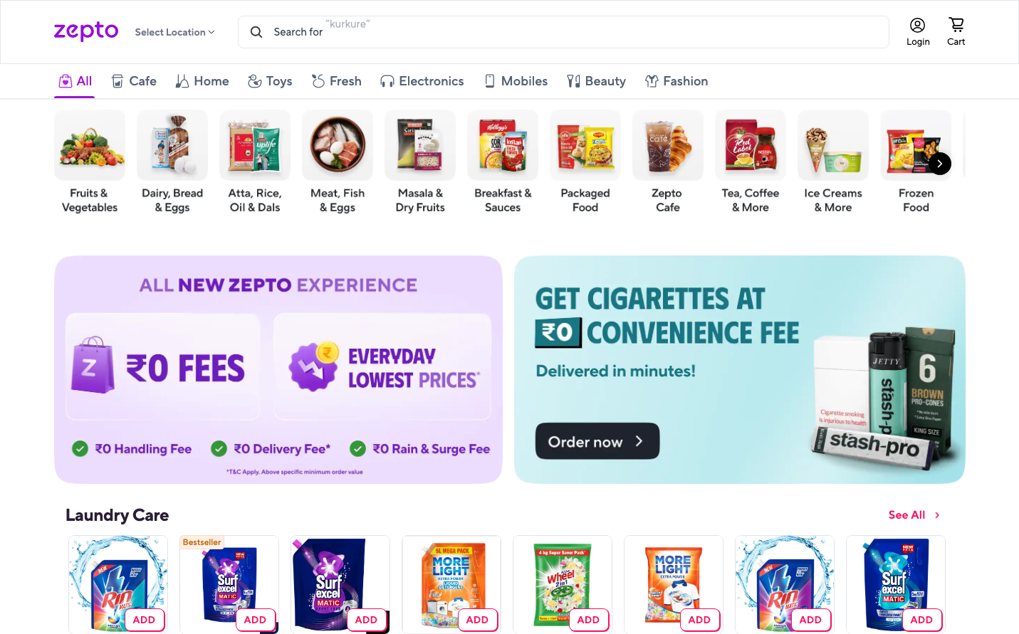 Zepto embodies instant gratification commerce with its vibrant purple signature and energetic gradient-filled promotional banners that scream speed and convenience. The custom 'Zepto Norms' typography creates a friendly yet professional tone that makes quick shopping feel trustworthy and approachable.